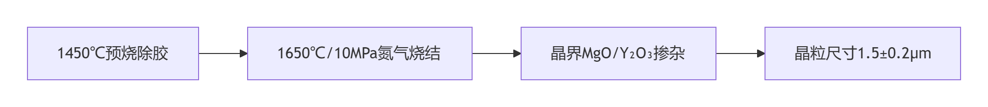 1450℃預燒除膠 1650℃/10MPa氮氣燒結 晶界MgO/Y?O?摻雜 晶粒尺寸1.5±0.2μm